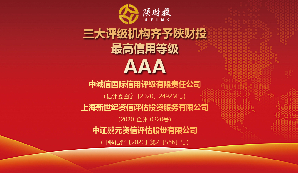 近日,陜西財金投資管理有限責任公司獲得中誠信國際、上海新世紀、中證鵬元三家主流評級機構的AAA級主體信用等級,該評級結果為當前資本市場(chǎng)最高信用等級,上述三家評級機構在銀行間市場(chǎng)、交易所市場(chǎng)排名均居前列,公信力強。