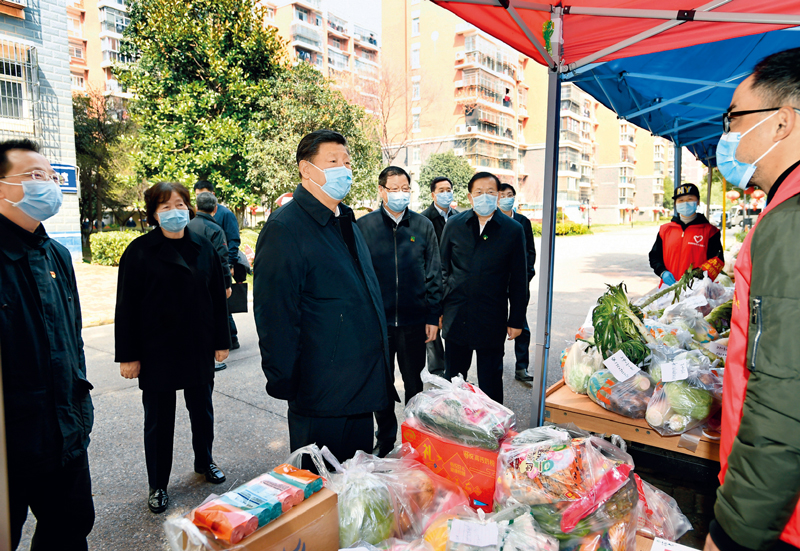 2020年3月10日,中共中央總書(shū)記、國家主席、中央軍委主席習近平專(zhuān)門(mén)赴湖北省武漢市考察新冠肺炎疫情防控工作。這是習近平在東湖新城社區生活物資集中配送點(diǎn),詳細詢(xún)問(wèn)社區群眾生活物資采購和供應情況。 新華社記者 謝環(huán)馳/攝